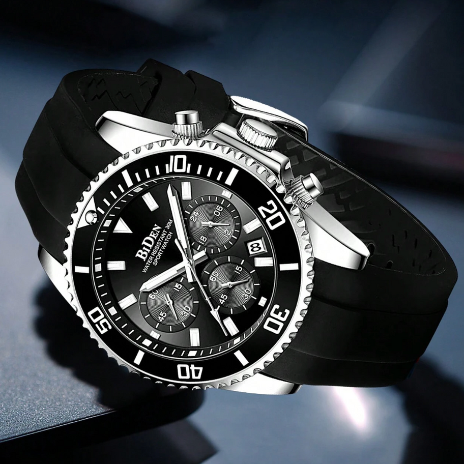 combina fuerza, precisión y elegancia en un diseño pensado para quienes dominan cada segundo. Su caja de acero inoxidable pulido y bisel rotativo destacan sobre una correa de silicona negra de alta resistencia, ofreciendo comodidad y durabilidad.